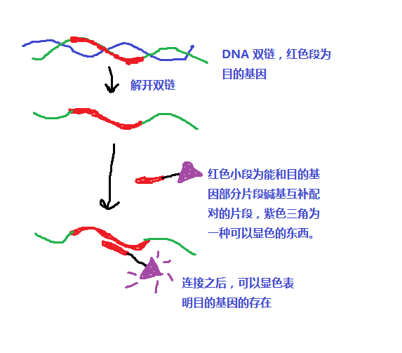 За відповідних pH, температури та іонної сили зонд ДНК може утворювати водневий зв’язок із комплементарною неміченою одноланцюговою ДНК або РНК у досліджуваному зразку, використовуючи високу точність молекулярної денатурації, ренатурації та комплементарного спарювання основ. об'єднуються, утворюючи дволанцюговий комплекс.