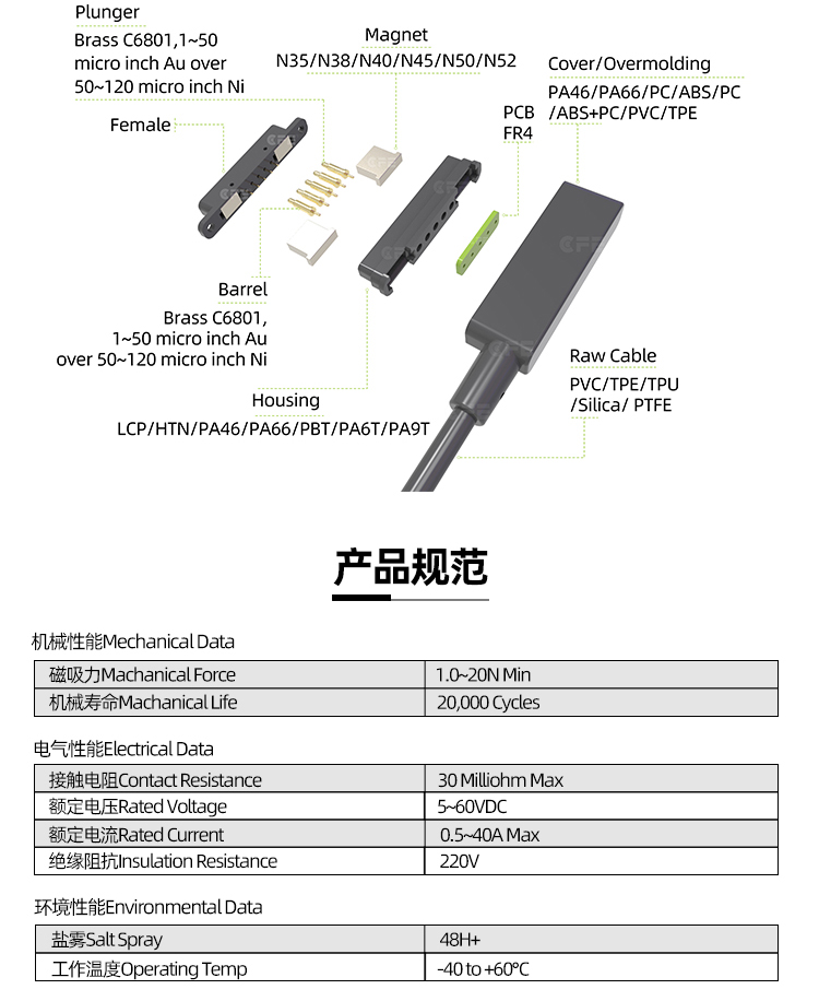 Магнітний з'єднувач - це комбінація магнітів на основі роз'єму pogo pin, а використання постійних магнітів RuFeB забезпечує стабільне та надійне з'єднання між штекером і гніздом. Магнітний з'єднувач Pogopin компенсує переваги зручного вставлення, безпеки, компактного розміру, легкого очищення та бічного вилучення, яких не вистачає традиційним з'єднувачам, і справді реалізує 100-відсоткове автоматичне позиціонування, автоматичне з'єднання, швидке вставлення, відокремлення зовнішньою силою, примусове відключення не пошкодить порт підключення та інші функції пристрою; його швидко популяризували та використовували в багатьох сферах.